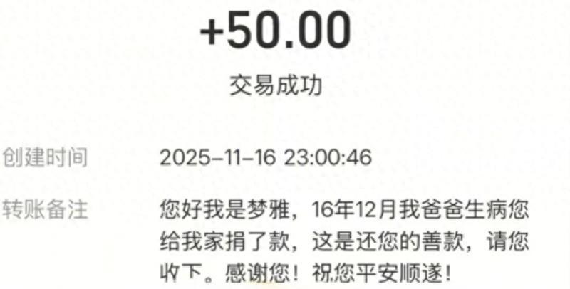 近日,一则卓著十年的 “还款故事” 在收集上柔顺刷屏,共青团中央、东说念主民日报等官方平台纷纷转发点赞,让 “善意传递” 成为热议话题。在这场卓著10年的善意传递中,网友收到了曾在高中时为患病的梦雅父亲捐出 50 元善款与暖心祝颂。这份迟来的诚信与感德,不仅戳中了多数东说念主内心最优柔的旯旮,更让公共看到了大病求援平台中双向奔赴的柔顺。