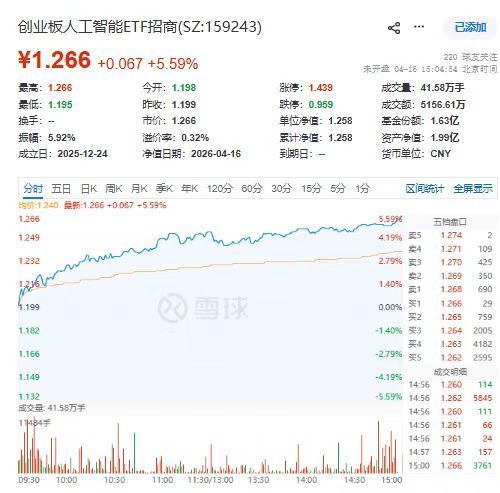 4月16日,AI板块全线爆发。畛域收盘,创业板东谈主工智能ETF招商(159243)大涨近5.6%,领涨两市主题ETF,成为当日阛阓最看重的明星。
