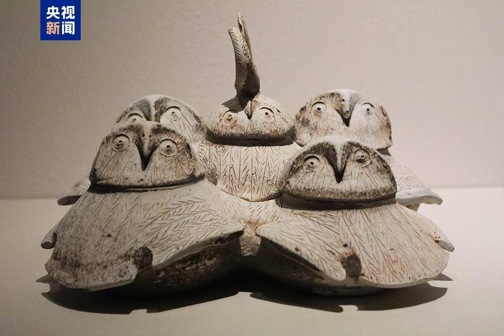 r△ 东汉陶鸮形五联罐,广州市文物考古辩论院(南汉二陵博物馆)藏。