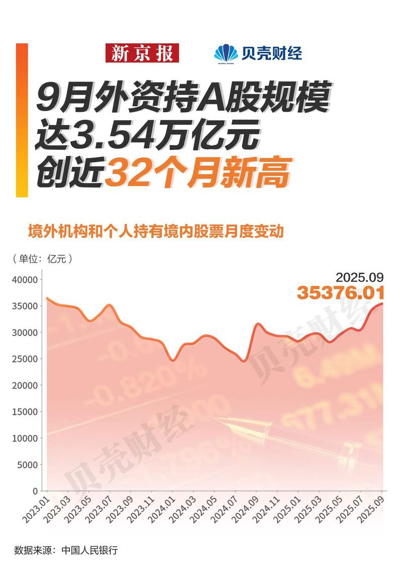 这并非外资抓股的通盘资金。把柄央行裸露数据,本年9月末境外机构和个东谈主抓有境内股票3.54万亿元,连气儿四个月站上3万亿元,创下近32个月新高,外资全体加配A股趋势彰着。
